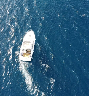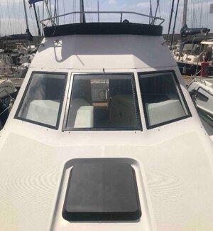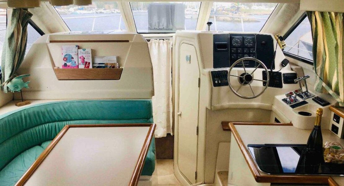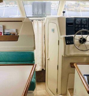 The boat is an American Bayliner Ciera 3058 Command Flybridge, equipped with two Mercruiser engines totaling 400 hp running on gasoline. It has a spacious interior, with approximately 1.85 meters of headroom in the dinette and bathroom. It is very comfortable with dimensions of 9.32 meters in length and 3.05 meters in width.